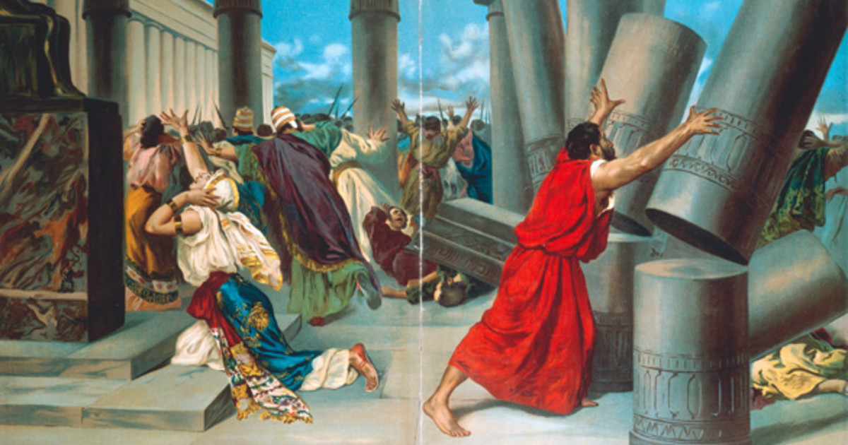 Aber jedes Mal, wenn Delila Simson nach dem Geheimnis seiner Stärke befragte, erzählte er eine andere Geschichte: „Fessle mich mit neuen Bogensehnen und ich werde so schwach wie jeder andere Mensch“, sagte er, oder „Fessle mich mit neuen Seilen“, oder „Verwebe mein Haar in deinem Webstuhl.“ Delila probierte alles aus, aber Simson blieb stark. „Wenn du mir das Geheimnis nicht verraten willst, dann liebst du mich nicht richtig“, nörgelte Delila. „Schließlich gab Simson nach. „Mein Haar ist ein Zeichen dafür, dass ich zu Gott gehöre. Wenn es abgeschnitten wird, verliere ich meine ganze Kraft, erzählte er ihr. In dieser Nacht, als Simson fest schlief, rief Delila einen Mann, der Simsons Haar abschnitt. Dann kamen die Philister und nahmen ihn gefangen. Simson wurde geblendet, in Ketten gelegt und in ein Gefängnis in Gaza gebracht, wo er schwere Arbeit verrichten musste. Aber langsam begann Simsons Haar wieder zu wachsen. Eines Tages hielten die Philister ein Fest zu Ehren ihres Gottes Dagon. Sie brachten Simson vom Gefängnis zum Tempel. Der Tempel war voll mit Tausenden Menschen die Simson verspotteten. Simson betete zu Gott ihm Kraft zu geben. Er stieß mit aller Kraft gegen zwei Säulen, die das Gebäude trugen. Der Tempel stürzte zusammen und alle darin starben. Dies war Simsons letzte Tat gegen die Feinde von Israel. Er hatte zwanzig Jahre gegen sie gekämpft.
