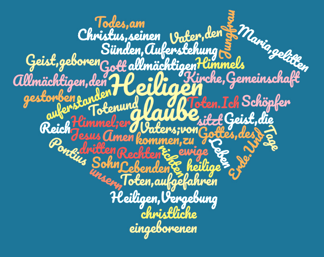 Ich glaube an Gott, den Vater, den Allmächtigen, den Schöpfer des Himmels und der Erde, / und an Jesus Christus, seinen eingeborenen Sohn, unsern Herrn, / empfangen durch den Heiligen Geist, geboren von der Jungfrau Maria, / gelitten unter Pontius Pilatus, gekreuzigt, gestorben und begraben, / hinabgestiegen in das Reich des Todes, am dritten Tage auferstanden von den Toten, / aufgefahren in den Himmel; er sitzt zur Rechten Gottes, des allmächtigen Vaters; / von dort wird er kommen, zu richten die Lebenden und die Toten. / Ich glaube an den Heiligen Geist, / die heilige katholische Kirche, Gemeinschaft der Heiligen, / Vergebung der Sünden, / Auferstehung der Toten / und das ewige Leben. / Amen.