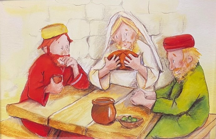 Später traf Jesus zwei seiner Jünger, die aus Jerusalem kamen. Sie erkannten ihn nicht und luden ihn zum Essen ein. Als Jesus das Brot segnete und brach, wussten die beiden Männer, wer er war. Dann verschwand Jesus. Die zwei Männer liefen zurück nach Jerusalem, um ihren Freunden zu berichten, was geschehen war. Als die Männer die Geschichte vortrugen, erschien Jesus plötzlich und sage: „Friede sei mit euch.“ Die Jünger waren sehr erschrocken, denn sie dachten, sie sähen einen Geist. „Seht und berührt meine Hände und Füße“, sagte Jesus und zeigte seine Wunden. „Geister sind nicht aus Fleisch und Blut.“ Dann setzte er sich und aß mit ihnen und sie wussten, dass dies wirklich Jesus war, der von den Toten auferstanden sei.