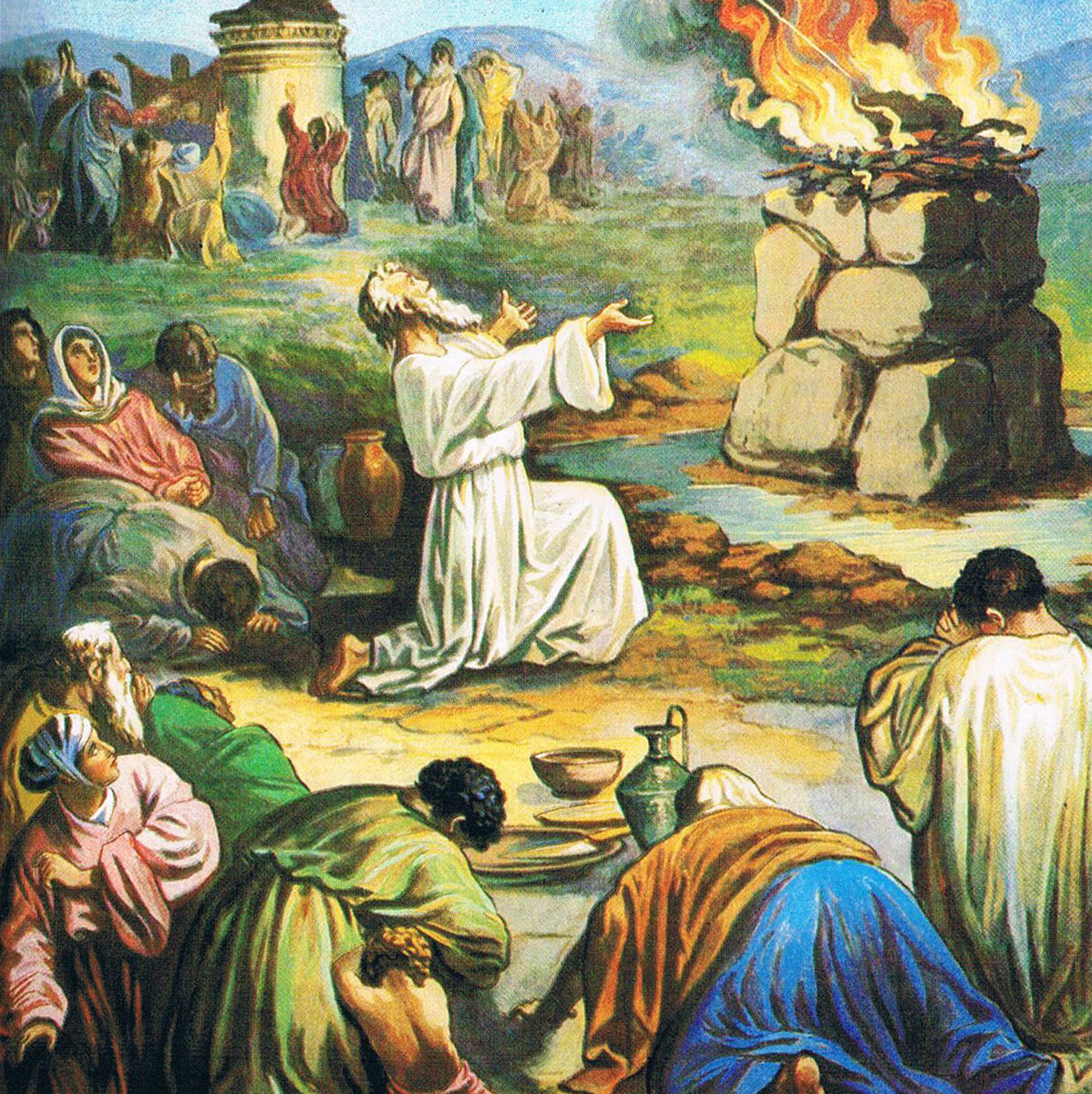 Eines Tages befahl Gott Elia zu Ahab zurückzukehren. „Warum bist du zurückgekommen, du Unruhestifter?“, fragte der König. „Du hast Gott nicht gehorcht“, antwortete Elia. „Schick deine Leute und die Propheten von Baal zum Berg Karmel, um mich dort zu treffen.“ Ahab tat, was Elia verlangte, und als alle versammelt waren, sagte Elia: „Es ist Zeit zu sehen, wer der wahre Gott ist.“ Dann forderte Elia die Propheten von Baal heraus. „Opfert ihr eurem Baal einen Stier und auch ich werde meinem Gott einen Stier opfern. Der wahre Gott wird der sein, der Feuer vom Himmel schickt und den Altar in Flammen setzt.“ Die Priester von Baal bauten ihren Altar und legten einen Stier darauf. Sie riefen den ganzen Tag über ihren Gott an, aber nichts passierte. Elia baute seinen Altar mit einem Graben darum, den er mit Wasser füllte. Er legte den Bullen auf das Holz und begoss alles mit Wasser. Dann begann Elia zu beten. Gott sandte Feuer herab, und obwohl das Holz feucht war, ging es in Flammen auf. Da rief das Volk: „Der Herr ist der wahre Gott.“